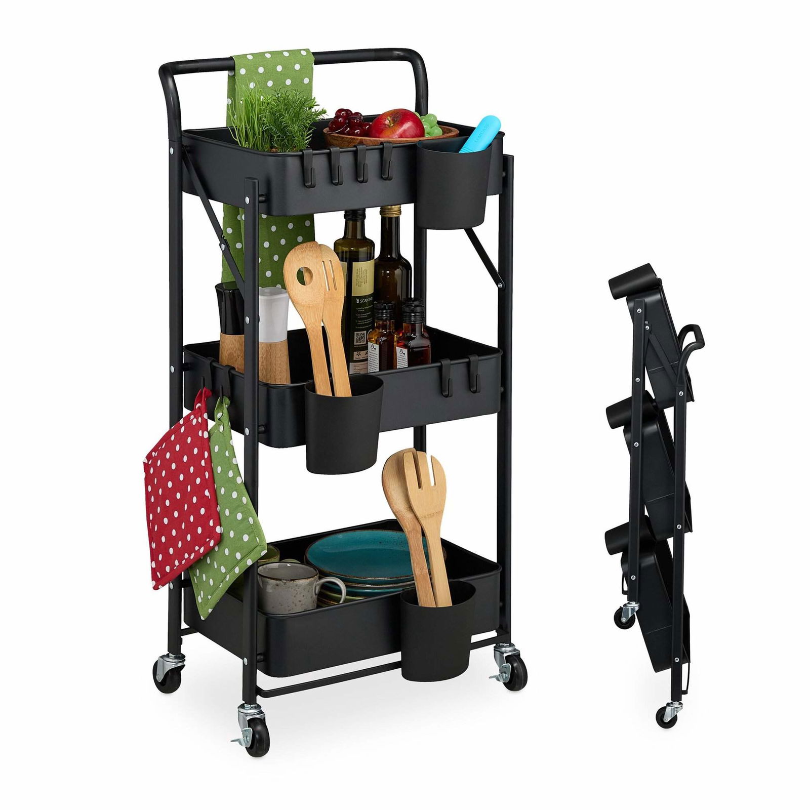 johgee Vikbar rullvagn i metall med 3 nivåer, hopfällbar mobil multifunktionsförvaring, vagn för hem, bibliotek, kontor (svart)