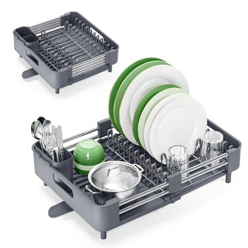 Kingrack Expanderbart, hopfällbart diskställ i rostfritt stål med avtagbar bestickhållare och repfritt tallriksställ, justerbart torkställ med svängbar dräneringspip