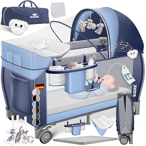 KIDIZ® Babysäng, 3-i-1 resesäng, kombi-set, med skötbädd, myggnät, lekhage, kan användas från födseln och upp till 15 kg, luftiga sidoväggar med sidoingång, med väska, hopfällbar, blå
