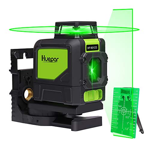Huepar 901CG 360 lasernivå grön omkopplingsbar tvärlinje självnivellering med pulsläge, 1 x 360 graders horisontell linje + 130 graders vertikal stor fläktvinkel, med magnetisk roterande bas och bandkort
