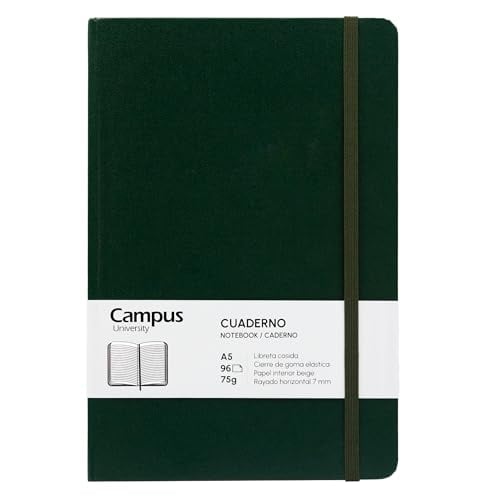 Campus A5-anteckningsbok, Bullet Journal med horisontell linjerad 7 mm, inbunden anteckningsbok med 96 ark på 75 g, elastisk stängning, ficka och bokmärken. (A5, horisontell linje, mörkgrön)