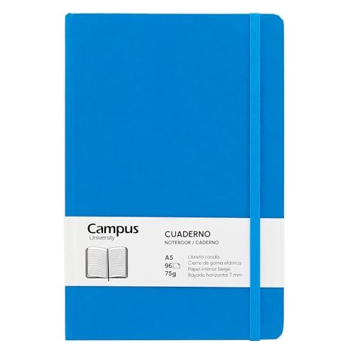 Campus A5-anteckningsbok, Bullet Journal med horisontell linjerad 7 mm, inbunden anteckningsbok med 96 ark på 75 g, elastisk stängning, ficka och bokmärken. (A5, horisontell linje, himmelsblå)