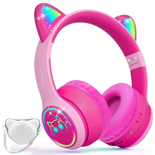 IFECCO Bluetooth-hörlurar för barn med mikrofon, söta upplysta kattöron barn flickor trådlösa hörlurar volymbegränsande för skola resor gåvor