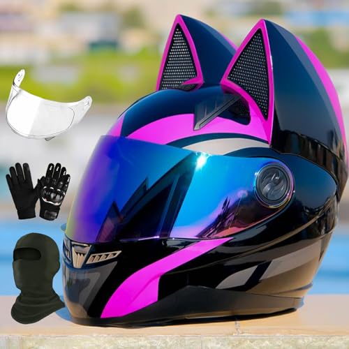 Motorcykelhjälm Söta tecknade kattöron med hörlurar, män och kvinnor cool katt lokomotiv hjälm fullt ansikte motorcykel vuxen alla årstider, ECE-certifierad