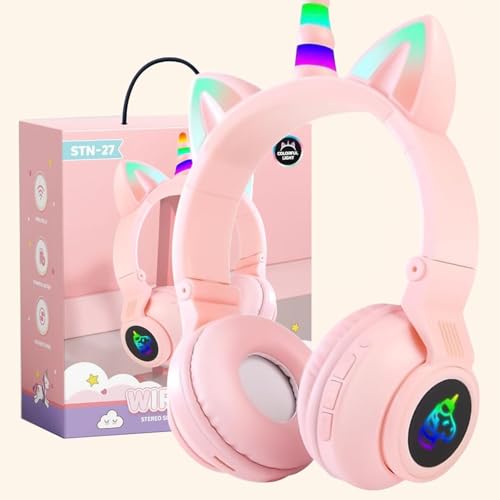 AXFEE Bluetooth barnhörlurar, LED upplyst kattöron trådbunden/trådlösa hörlurar, HD stereoljud, hopfällbara barnhörlurar för PC telefonplatta arbetsrum resa skola, lämplig för flickor pojkar gåva