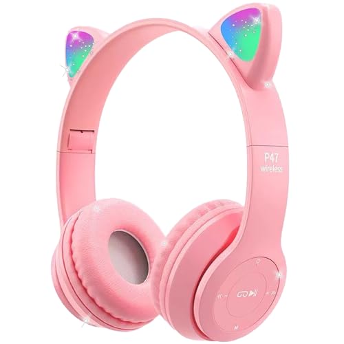 Megadream Barn kattöron hörlurar, Bluetooth-hörlurar LED Light Up barn trådlöst fällbart headset över öra för flickor/pojke ålder 8 (ROSA)