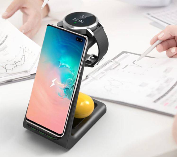 3 i 1 Trådlös bordsladdare, QI fastcharge, 15W, för mobil, hörlurar och smartwatch, 3i1
