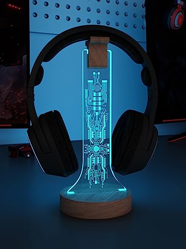 Ammonite hörlursstativ – valnöt spelskrivbord tillbehör med LED-lampor, USB-ström och PCB-mönster gamer vän pojke man – blått och rosa ljus för spelrum dekoration