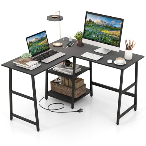 COSTWAY Skrivbord i L-form, hörnskrivbord med uttag och USB-portar, hörnbord med förvaringsytor, datorbord, kontorsbord för hemmakontor, 120 x 120 x 75 cm (svart)