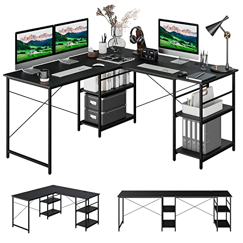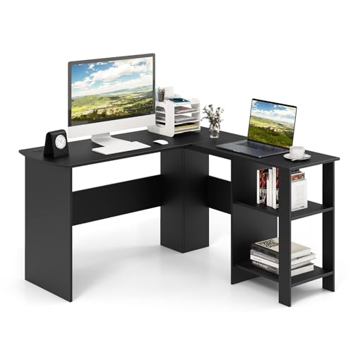 COSTWAY Skrivbord L-form, vändbart hörnskrivbord med 4 hyllor, hörnbord med 3 kabelhål, speldatorbord, kontorsbord för hemmakontor, 151 x 151 x 75 cm (svart)