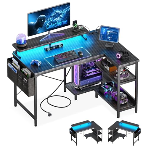 Coleshome Gamingbord L-Form med LED-belysning & Inbyggda Uttag, Hörnbord med Hylla Reversible Skrivbord med Monitor för Hemmakontor (Svart kolfiber, 100x80cm)