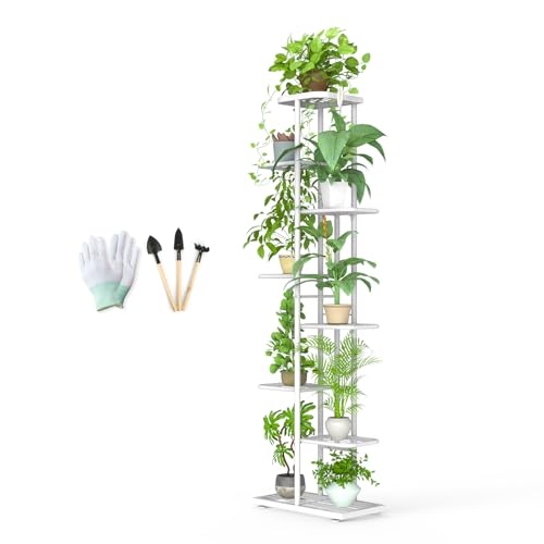 MAIJIAJU blomställ i 8 våningar, vit med trädgårdsredskap och handskar, 141 cm högt växtstativ metall inomhus utomhus, flervåningshylla, växttrappa, hörnhylla, stående för trädgård, balkong,