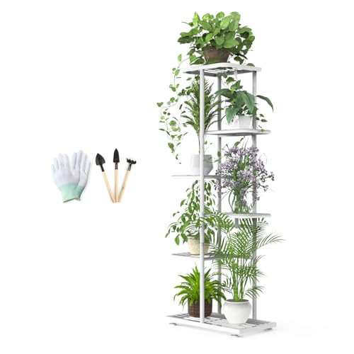 MAIJIAJU Blomställ i 6 våningar, vitt med trädgårdsredskap och handskar, 108 cm högt växtstativ metall inomhus utomhus, flervåningshylla, växttrappa, hörnhylla, stående för trädgård, balkong,