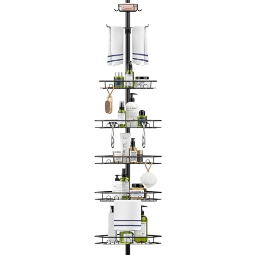 Bomclap 7 nivåer teleskop duschhylla, hörnhylla i metall med handdukshållare, duschhylla utan borrning med handduksstång, duschhörn för 137–290 cm höjd (svart)