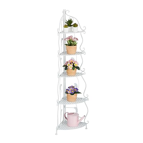Relaxdays Hörnhylla metall, 5 hyllor, HBT: 136 x 30 x 30 cm, växthylla fristående, vikbar, vintage-look, vit, stål, plast