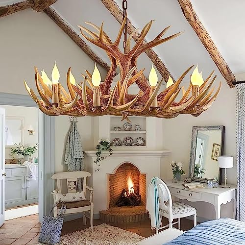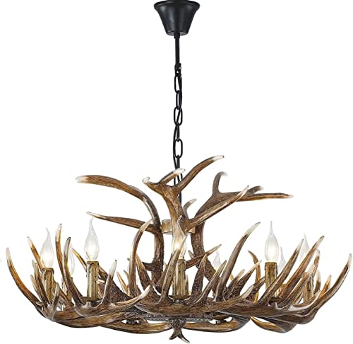 Ljuskrona med horn, stor lantlig hornlampa i resin, matsal, kök lämplig för familjen (9 lampor med 12 horn)