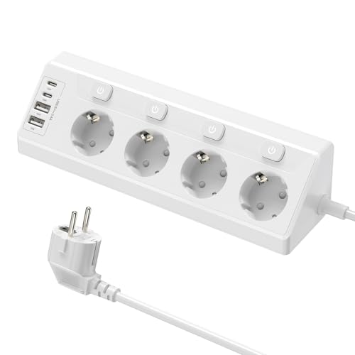 FDTEK Grenuttag Med 4 Separata Brytare & USB-C PD 20W (4000 W/16 A), Platt Bordskontakt Med 2 M Kabel, Hörnuttag För Hemma Och Kontor, Vit