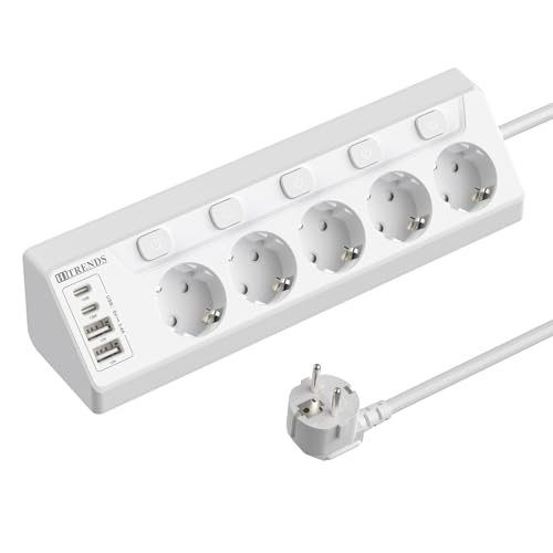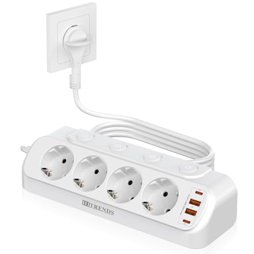 HITRENDS Vinkeluttag med USB, 5 bordsuttag med strömbrytare, hörnuttag med 2 USB och 2 Typ-C, 9 i 1 överspänningsskydd med 2 m kabel, vit
