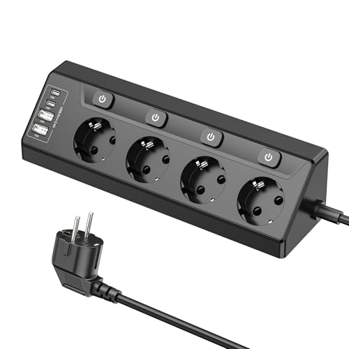 4-vägs grenuttag med USB C, hörnuttag med 4 USB-portar och strömbrytare, skrivbordsuttag med överspänningsskydd och 3M-kabel för köket (svart)