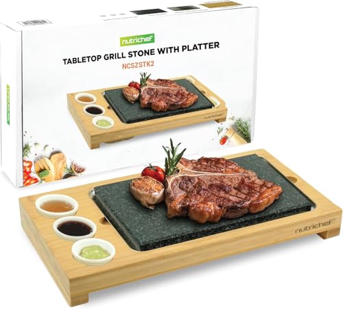 NutriChef Sizzle Hot Cooking Stone Grill with Bamboo Platter, Tabletop Granite Stone Grill with Non-Slip Handles, Adjustable Temperature Control, 550°F Max Heat - Perfect for Meats and Vegetables