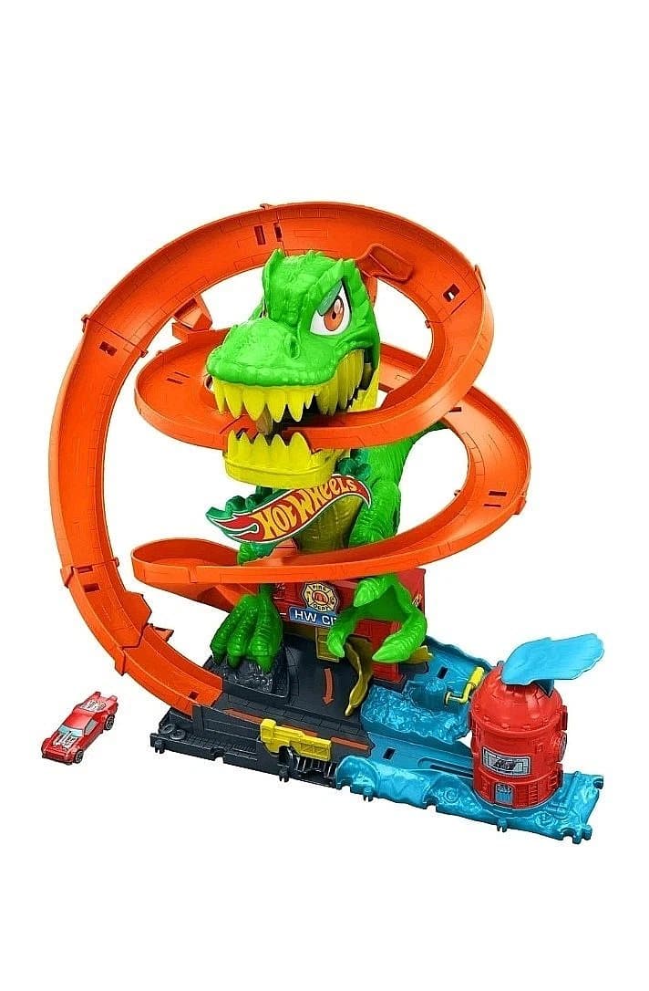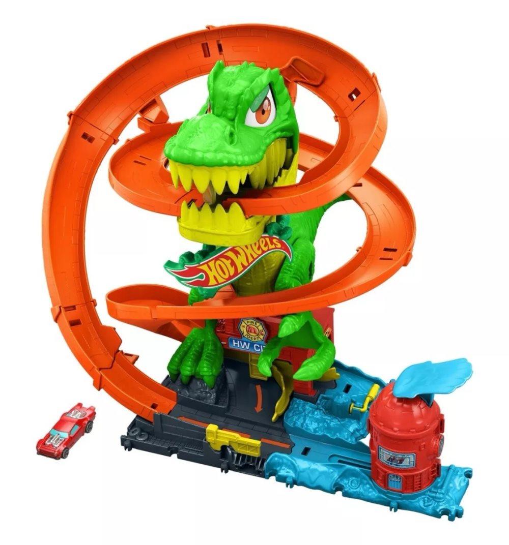 Hot Wheels City T-Rex Blaze Battle playset Race Cars Dinosaur Track Car Toy