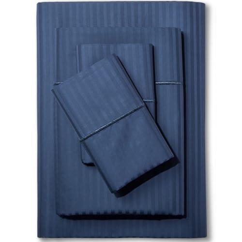 Fjäder och söm 500 TC king size damast sänglakan, 100% mjuk bomull andningsbara lakan, 45 cm djupa fickor satin väv randiga sängkläder madrass resort hotell lyxig inredning – (mörkblå, kung)