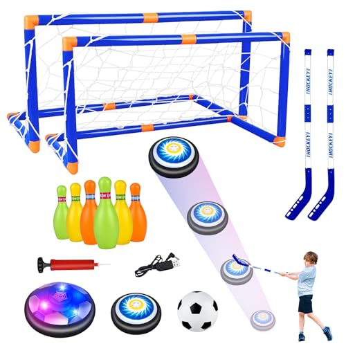 deAO Air Hockey fotbollsleksak, 4-i-1 uppladdningsbar hover hockeyfotbollsset med 2 fotbollsmål, 2 hockeyklubbor, 6 bowlingbollar, 2 LED air power fotboll, presenter till jul födelsedag