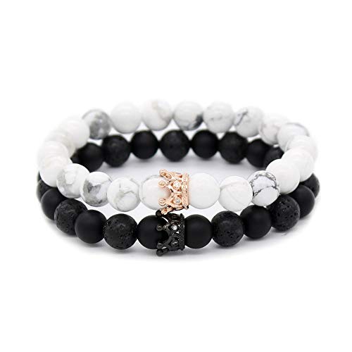 Armband Queen och King Crown naturstenspärlor för par, elastiskt armband av CZ kronor, kung och drottning, svart lava, vulkanisk sten och vit howlite, vänskapsarmband, pararmband, 8 mm, Sten