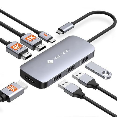 NOVOO 7-i-1 docking station med dubbla bildskärmar, UBS C till 2 HDMI 4K Hub, 8K Displayport, 100W PD, USB x 3, trippeldisplay dockningsstation för Dell, HP, Lenovo, ASUS, Microsoft