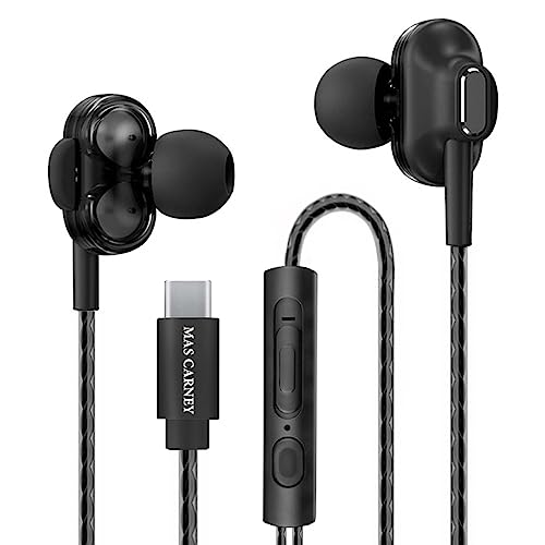 MAS CARNEY USB C Hörlurar TI9, Dubbel Högtalarsystem, Inbyggd Digital Chipset, Mikrofon, Fjärrkontroll, In-Ear-Telefoner Kompatibla med Smartphones Samsung, Huawei, OPPO, Google Pixel, iPad, Svart