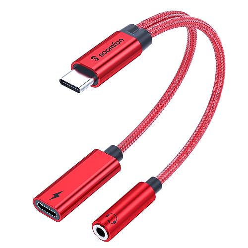 USB till uttag, SOOMFON USB C-hörlursadapter 3,5 mm jack laddning med PD 60 W snabbladdning 2 i 1 typ C Aux ljudkabel för Samsung S21/S20, Huawei P40/Mate40/30, Pixel 5/4 XL, röd