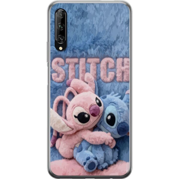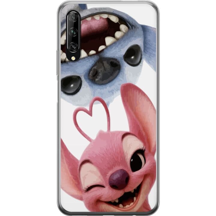 Huawei P smart Pro 2019 Genomskinligt Skal Lekfulla Stitch och Angel i närbild med stora skratt och hjärtformade detaljer som skapar charmig kärleksf