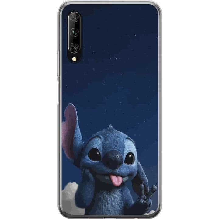 Huawei P smart Pro 2019 Genomskinligt Skal Stitch poserar lekfullt under natthimlen med stjärnor och moln, sticker ut tungan och gör ett fredstecken,