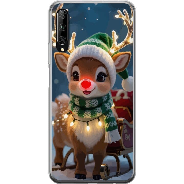 Huawei P smart Pro 2019 Genomskinligt Skal Julig ren med lysande horn, röd nos och stickad grön mössa står framför släde i snötäckt miljö och sprider