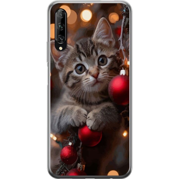 Huawei P smart Pro 2019 Genomskinligt Skal Söt kattunge bland julkulor och varma ljus med stora nyfikna ögon, omgivet av dekorationer som skapar magi