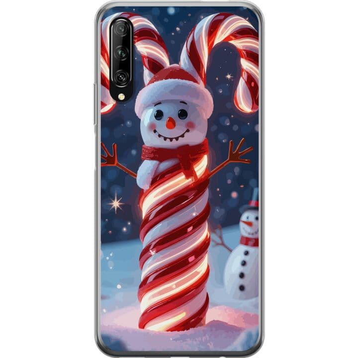 Huawei P smart Pro 2019 Genomskinligt Skal Glittrande julgodissnögubbe formad av polkagriskäppar lyser varmt i ett vinterlandskap med snöfall och fes