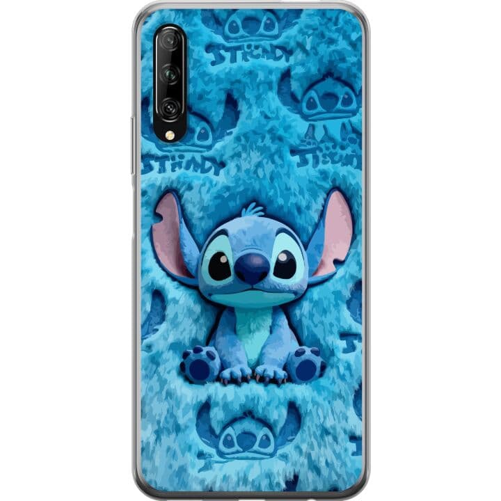 Huawei P smart Pro 2019 Genomskinligt Skal Stitch sitter på fluffigt blått mönster med sitt ansikte och öron upprepade som textur vilket skapar ett s