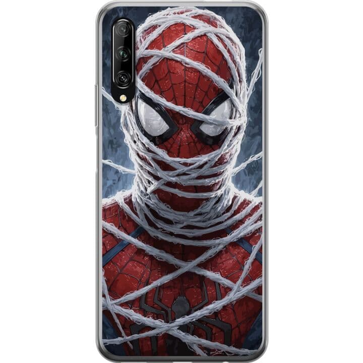 Huawei P smart Pro 2019 Genomskinligt Skal Spider-Man täckt av täta nätlager i dramatisk närbild som framhäver maskens struktur, intensitet och kraft