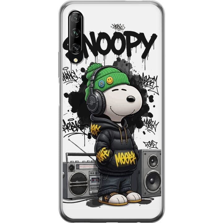 Huawei P smart Pro 2019 Genomskinligt Skal Snoopy i streetwear med hörlurar och graffitistil står bredvid en boombox och ler stort, ett urbant modern