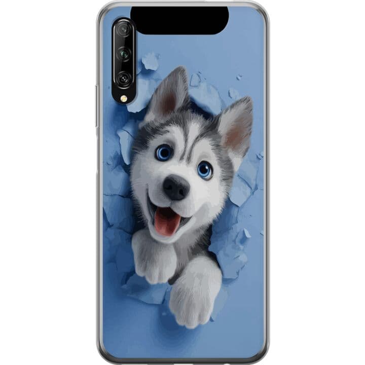 Huawei P smart Pro 2019 Genomskinligt Skal Söt huskyvalp med stora blå ögon tittar fram genom sönderbruten vägg i mjuk 3D-stil vilket skapar glatt li