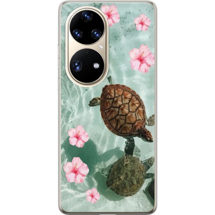 Huawei P50 Pro Genomskinligt Skal Sköldpaddor och hibiskus tropisk design med blommor och vatten, lugn semesterkänsla inspirerad av hav och paradis