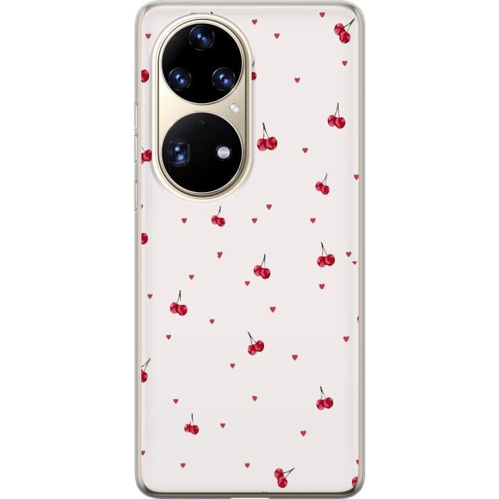 Huawei P50 Pro Genomskinligt Skal Körsbär och hjärtan på vit bakgrund, söt romantisk design med minimalistisk känsla och mjuka toner