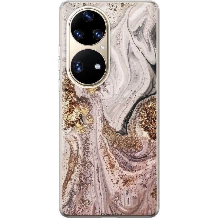 Huawei P50 Pro Genomskinligt Skal Beige marmor med guldglitter struktur, elegant design med lyxig känsla, perfekt för modern stil.
