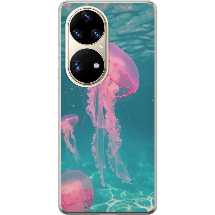 Huawei P50 Pro Genomskinligt Skal Rosa maneter i klart blått hav, magisk undervattensdesign med lugn drömmig känsla och pastellskimrande färger