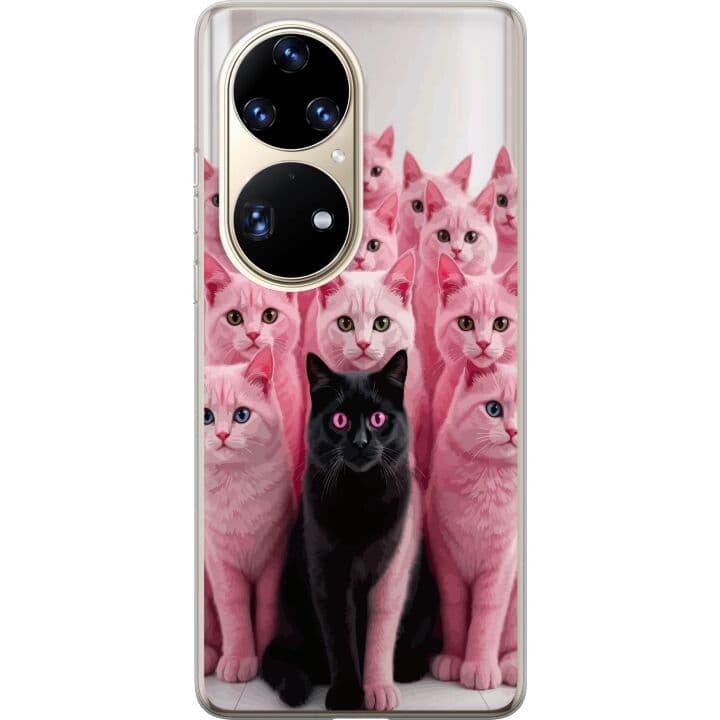 Huawei P50 Pro Genomskinligt Skal Svart katt bland rosa katter, rolig kontrastfylld design med lekfull charm och trendig färgkombination