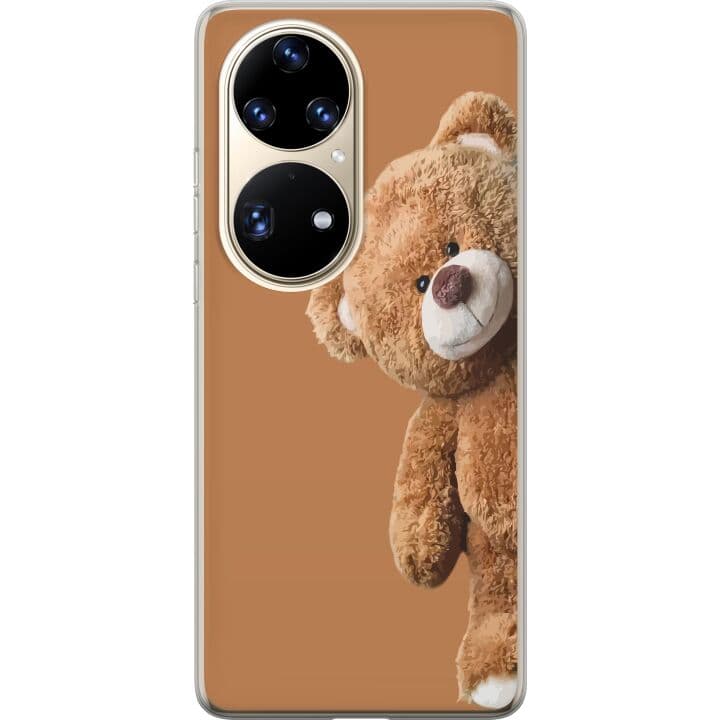Huawei P50 Pro Genomskinligt Skal Söt nalle som tittar fram på brun bakgrund minimalistisk varm design med humor och charm