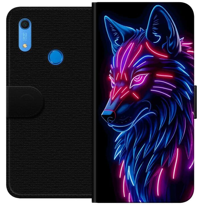 Kompatibelt Plånboksfodral till Huawei Y6s (2019) Neonupplyst varg i blått och rosa ljus med futuristisk cyberpunkkänsla