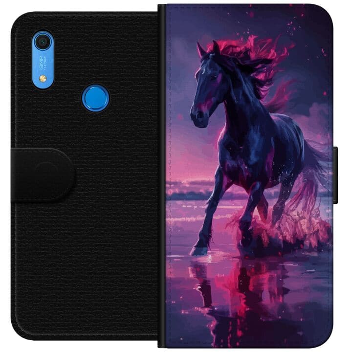 Kompatibelt Plånboksfodral till Huawei Y6s (2019) Elegant svart häst som springer genom vatten i lila och rosa ljus med magisk känsla.