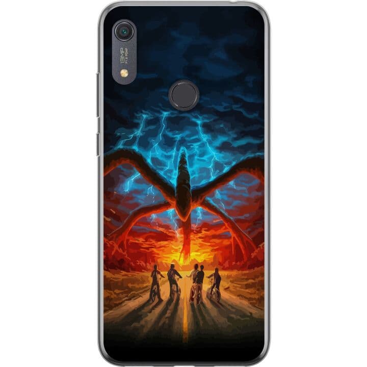 Kompatibelt Mobilskal till Huawei Y6s (2019) Dramatisk fantasibild med enormt monster, blixtar och cyklande barn mot glödande horisont