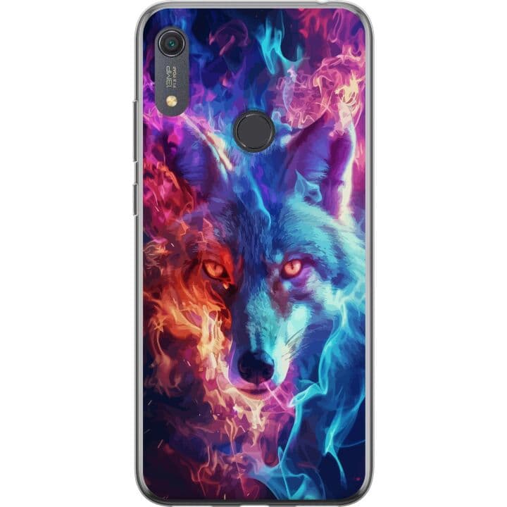 Kompatibelt Mobilskal till Huawei Y6s (2019) Intensiv varg med blå och orange eld runt ansiktet i kraftfull fantasyillustration